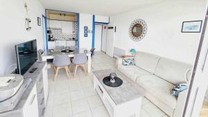 The apartment with a balcony and sea views has 1 bedroom, a living room, a TV, an equipped kitchen with a microwave and a fridge, and 1 bathroom with a shower.