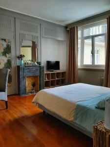Rooms: 5Located on the third floor (no elevator), this spacious and exceptionally pleasant room is cool in summer and very quiet, overlooking the courtyard. It features a large bathroom, tall windows, and charming decor with an arty touch—mixing blue, pink tones and floral wallpaper. The room is also equipped with a flat-screen TV, a desk area, a courtesy tray with tea and coffee, and free Wi-Fi access.