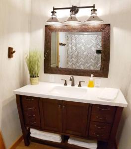 La maison de vacances Lakeside Retreat - Romantic Cabin - Resort Pool, Dock, Fire Pit! comprend 2 chambres, une cuisine et une télévision à écran plat.