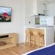 The 53 guest rooms are finished with wooden flooring and a floor-to-ceiling windows that lead to a private balcony. Each room is fitted with a kitchen with an induction stove as well as a living area with a wall-mounted flat-screen TV.