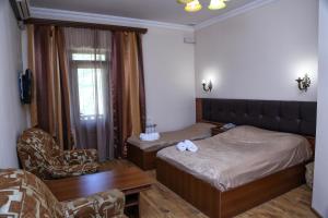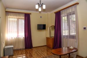 Room features a flat-screen TV and a fridge.