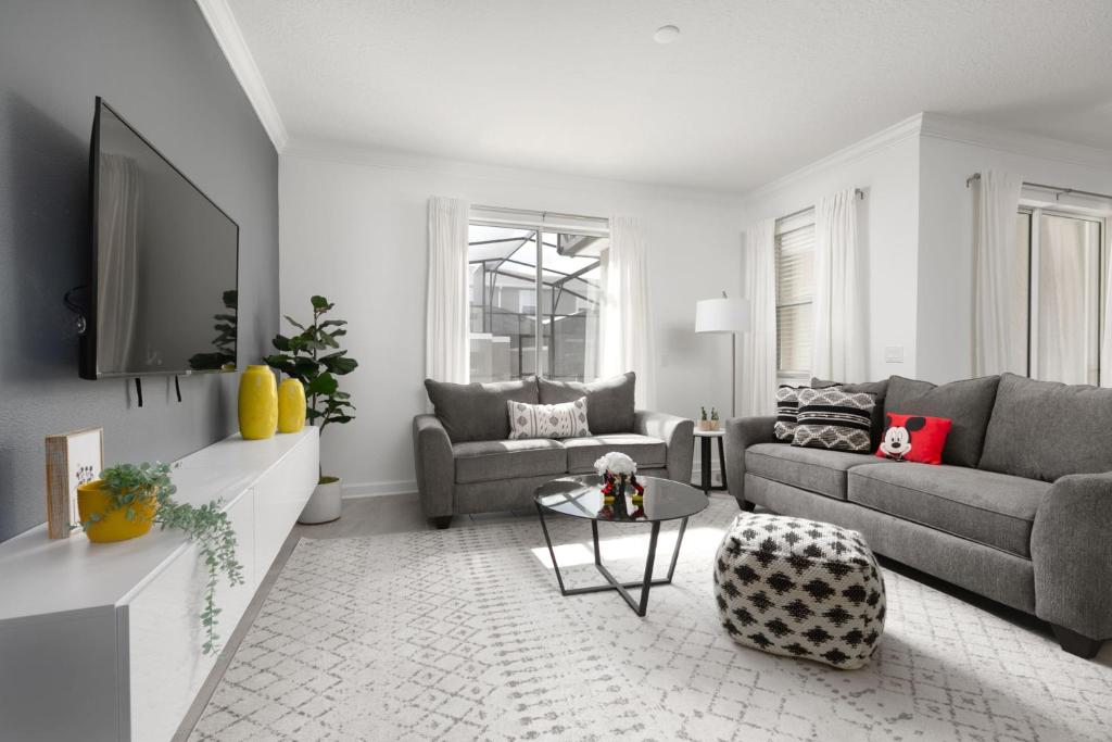 Tento klimatizovaný prázdninový dům v ubytování má 4 ložnice, 3 koupelny a kuchyň vybavenou lednicí a myčkou. V prázdninovém domě Last Minute Disney Getaway! Soukromý bazén, vířivka a herna jsou součástí ubytování. Book Now! #56757 nechybí TV a koupelna s fénem.
