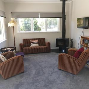 The farm stay with a patio and garden views features 2 bedrooms, a living room, a flat-screen TV, an equipped kitchen with a dishwasher and an oven, and 1 bathroom with a shower. Bed linen and towels are provided in the farm stay at the property. Lavender Row Farm also features a seating area and a fireplace.