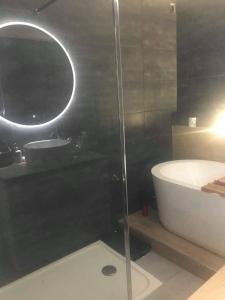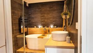 Apartmán LE COQUET - Gare - Hyper centre - Parking - Wifi - Netflix - Disney+ poskytuje 2 ložnice, 1 koupelnu, ložní prádlo, ručníky, satelitní TV s plochou obrazovkou, jídelní kout a plně vybavenou kuchyň. Z balkonu ubytování ubytování se otevírá výhled na hory. Koupelna v LE COQUET - Gare - Hyper centre - Parking - Wifi - Netflix - Disney+ je zařízena vanou, sprchou a fénem.