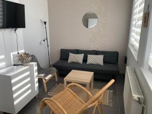Dwupokojowy apartament Le logis de la Marina mieści salon, kuchnię z lodówką i ekspresem oraz łazienkę z prysznicem i kosmetykami. Ręczniki i pościel są dostępne w apartamencie Le logis de la Marina.