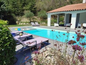 The spacious villa is fitted with 3 bedrooms, 2 bathrooms, bed linen, towels, a flat-screen TV with satellite channels, a dining area, a fully equipped kitchen, and a terrace with mountain views. Parquet floors, a fireplace, and a peaceful vibe enhance the ambience of the room at Le Mas des Doux Instants. Le Mas des Doux Instants includes an outdoor dining area.