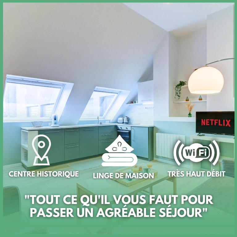 Apartmán LE MODERNE - Architect - Familial - HyperCentre - RENT IMMO nabízí 1 ložnici, 1 koupelnu, plně vybavenou kuchyň s jídelním koutem a lednicí a obývací část s TV s plochou obrazovkou. Apartmán LE MODERNE - Architect - Familial - HyperCentre - RENT IMMO je vybaven posezením, pračkou a koupelnou s fénem.