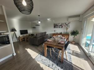 Klimatizovaný apartmán v Le Palmier d'Azur - Fréjus Cais - Wi-Fi má 2 ložnice, TV s plochou obrazovkou a kuchyň s myčkou a lednicí.