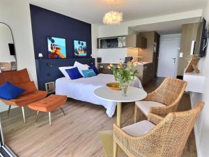 Apartmán Le Souffle Marin CONCARNEAU - VUE MER panoramique DIRECT sur la PLAGE des Sables Blancs FIBRE Parking PRIVÉ Secure PANORAMIC SEE VIEW direct ON BEACH zahrnuje 1 ložnici, 1 koupelnu, ložní prádlo, ručníky, TV s plochou obrazovkou, jídelní kout a plně vybavenou kuchyň. Hosté ubytování ubytování mohou využívat terasu s výhledem na moře. Koupelna v ubytování je vybavena sprchou, fénem a toaletními potřebami zdarma.