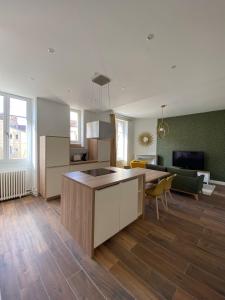 V apartmánu Le VH - Appartement 3 chambres jsou 3 ložnice, 1 koupelna, jídelní kout, plně vybavená kuchyň, TV s plochou obrazovkou, ručníky a ložní prádlo. Z balkonu ubytování ubytování se nabízí výhled na město. Koupelna v Le VH - Appartement 3 chambres disponuje sprchou, pračkou, fénem a toaletními potřebami zdarma.