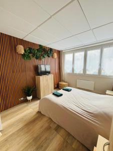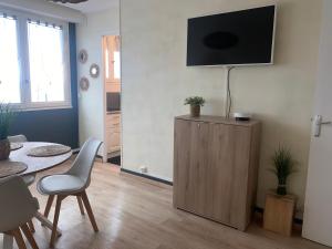 Apartmán Les anges bleus zahrnuje 1 ložnici, TV s plochou obrazovkou, jídelní kout, kuchyň s lednicí a obývací pokoj.
