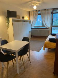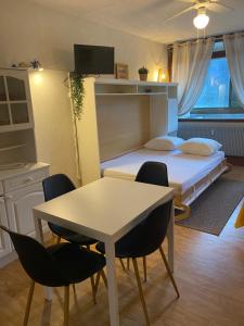 Diese Ferienwohnung ist ausgestattet mit einem TV. Die Küchenzeile ist eingerichtet mit einem Kühlschrank und einem Ofen, einer Mikrowelle sowie einer Kaffeemaschine und einem Wasserkocher.