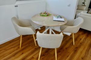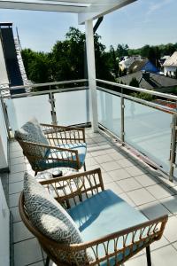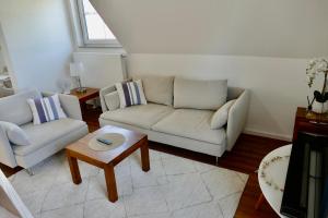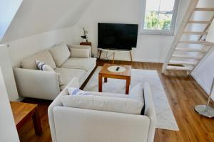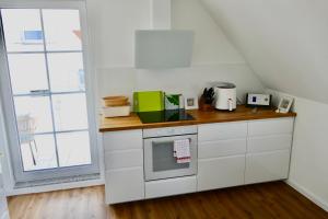 Apartmán Licht+Luft, Wohnen auf Zeit zahrnuje 1 ložnici, 1 koupelnu, ložní prádlo, ručníky, TV s plochou obrazovkou, jídelní kout a plně vybavenou kuchyň. Z balkonu ubytování ubytování se nabízí výhled na město. V koupelně ubytování ubytování nechybí sprcha ani fén.