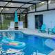 Dieses Ferienhaus ist ausgestattet mit 4 Schlafzimmern, 2 Badezimmern, Bettwäsche, Handtüchern, einem TV, einem Essbereich, einer voll ausgestatteten Küche und einer Veranda / Patio mit Poolblick.