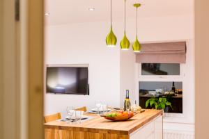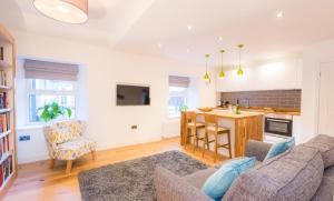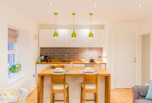 This holiday home has a super king-size bed, self contained property with full kitchen facilities, dining area and living area with flat screen TV, sofa and stocked bookcase.