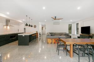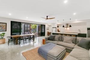 La casa con aire acondicionado en el alojamiento consta de 4 dormitorios, sala de estar, cocina equipada con nevera y cafetera, y 3 baños con ducha y bañera de hidromasaje. La casa o chalet Live the Casuarina Way - Beachside 4BR by uHoliday proporciona toallas y ropa de cama.