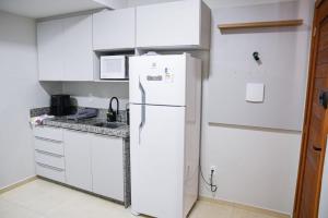 Diese klimatisierte Ferienwohnung im Loft 01 dormitório verfügt über 1 Schlafzimmer, einen Flachbild-TV, einen Essbereich, eine Küche mit Kühlschrank und ein Wohnzimmer.