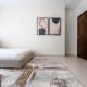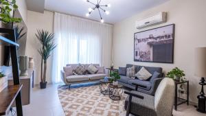 El apartamento con aire acondicionado de Mabaat-Superior 2BR-Emaar - 514 incluye 2 dormitorios, sala de estar, cocina equipada con nevera y cafetera, y 2 baños con bidet y ducha.