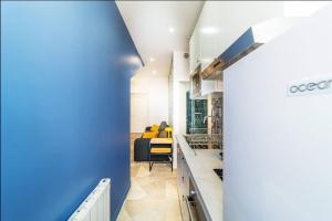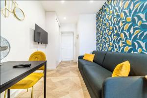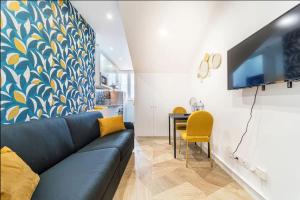 Apartament z 1 sypialnią w Magenta, Charmant & Moderne mieści salon z telewizorem, kuchnię z lodówką i piekarnikiem oraz łazienkę z suszarką.