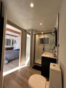 This spacious apartment at Maison chaleureuse atypique consists of 1 bedroom, a living room, 2 bathrooms, and a fully equipped kitchen. A flat-screen TV is available.
