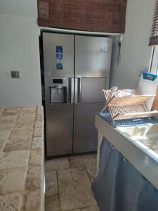 Dieses Ferienhaus hat eine Terrasse, 2 Schlafzimmer, ein Wohnzimmer und eine gut ausgestattete Küche mit einem Kühlschrank und einem Geschirrspüler. Es gibt einen Flachbild-TV.
