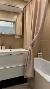 Questo appartamento con balcone e vista sul giardino presenta 1 camera da letto, un soggiorno, una TV a schermo piatto, una cucina con frigorifero e forno e 1 bagno con vasca da bagno. Lenzuola e asciugamani sono a vostra disposizione presso Maja apartamentai.
