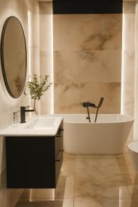 Apartament Manu Park Apartament z Garażem Centrum oferuje 1 sypialnię, 1 łazienkę, pościel, ręczniki, jadalnię i w pełni wyposażony aneks kuchenny. W obiekcie dostępny jest telewizor z płaskim ekranem oraz patio z widokiem na miasto.