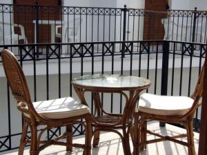 Classically furnished room with cool tiled floors and furnished balcony.