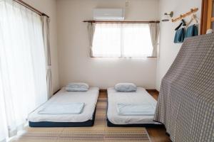 The quadruple room offers air conditioning, tatami, a terrace with mountain views as well as a shared bathroom featuring a bath. The unit offers 4 futons.