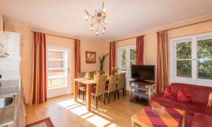 Spacious apartment on the ground floor, featuring a terrace with mountain views, 2 bedrooms, 2 bathrooms with a shower and toilet, a fully equipped kitchen with a seating area, and a living area with a sofa, tiled stove, flat-screen satellite TV, radio, and CD player. Pets are not allowed in this room type.