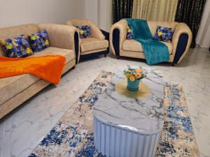 Featuring a private entrance, this holiday home also is comprised of 3 separate bedrooms, 3 bathrooms, a living room and a seating area. The holiday home's kitchen is available for cooking and storing food. This holiday home offers a tiled floor, a flat-screen TV and garden views. The unit offers 5 beds.
