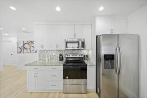 Klimatizovaný prázdninový dům Miami Oasis- Pool & Game Fun zahrnuje 4 ložnice, obývací pokoj, plně vybavenou kuchyň s lednicí a myčkou a 3 koupelny. Koupelna je vybavená sprchou.
