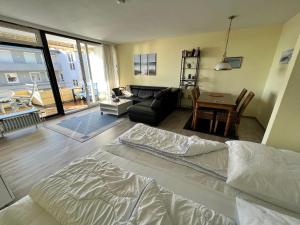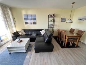 Featuring sea views and a balcony, this apartment at Miramar, Whg 608 includes 1 bedroom, a living room, a TV, a bathroom with a shower, and a kitchen with oven and dishwasher. Miramar, Whg 608 includes an outdoor dining area.