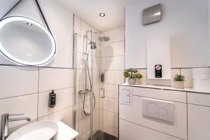 Apartmán Mitten in Bremen - City-Apt - Eigenständiger Check-in - TV zahrnuje 1 ložnici, plně vybavenou kuchyň s lednicí a mikrovlnnou troubou a 1 koupelnu se sprchou. V apartmánu Mitten in Bremen - City-Apt - Eigenständiger Check-in - TV je také TV s plochou obrazovkou a koupelna s toaletními potřebami zdarma.