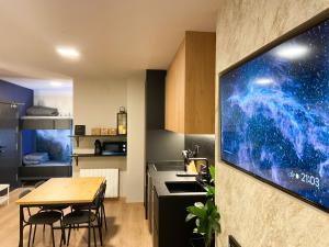 Die Unterkunft Modern Blue Studio En Valle De Incles - Parking Gratis l by BonesVacances ist ausgestattet mit 1 Schlafzimmer, einer Küche mit einem Kühlschrank und einem Geschirrspüler, einer Waschmaschine und 1 Badezimmer mit einem Haartrockner. In dieser Ferienwohnung werden Handtücher und Bettwäsche angeboten.