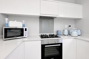 Apartmán v Modern Luxury apartment in Hyde Park, Sandton má 2 ložnice, balkon a plně vybavenou kuchyň. Vybavení ubytování zahrnuje TV s plochou obrazovkou.