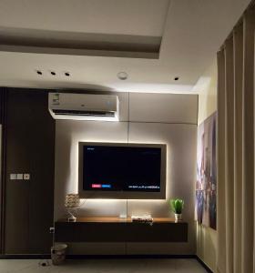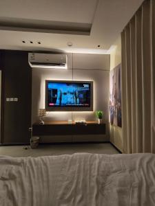 Klimatyzowany apartament Modern Studio with a screen on the bed posiada sypialnię i telewizor.