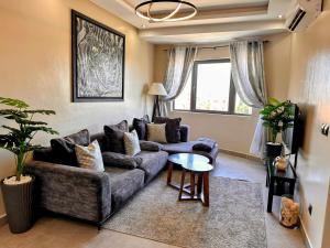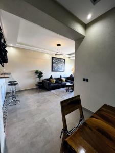 This apartment has a microwave, oven, a dishwasher and seating area.