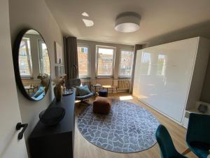 Apartmán Modernes Apartment no8 in bester Stadtlage s výhledem na město má 1 ložnici a 1 koupelnu s fénem a toaletními potřebami zdarma. Apartmán má také kuchyň s kompletním vybavením včetně lednice, mikrovlnné trouby a varné desky a koupelnu.