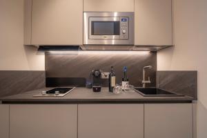 Questo appartamento con aria condizionata prevede 1 camera da letto e 1 bagno con bidet, doccia e asciugacapelli. La cucina presenta frigorifero, microonde e piano cottura, più macchina da caffè e bollitore elettrico.