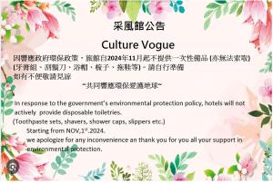 Morwing Hotel - Culture Vogue is 1 metro stop away from Ximending Shopping Area, whie National Chiang Kai-Shek Memorial Hall is 2 metro stops away. It takes 20 minutes’ drive from Taipei Songshan Airport to the property, while Taiwan Taoyuan International Airport in 50 minutes’ car journey. For guests’ convenience, airport shuttle service can be arranged based on request.