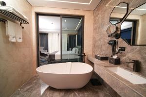 The hot tub is a top feature of this suite. This spacious suite comes with 1 living room, 1 separate bedroom and 1 bathroom with a bath and free toiletries. The air-conditioned suite features a flat-screen TV with satellite channels, soundproof walls, a minibar, a tea and coffee maker as well as mountain views. V této ubytovací jednotce se nachází 2 postele.