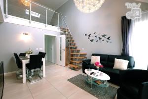This apartment has • 2 bedrooms • 3 beds • 2 flat screen TVs • a bath tub • a shower • a fully equipped kitchen