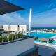Wszystkie pokoje i apartamenty typu suite dysponują prywatnym balkonem z widokiem na morze, a ich wnętrza urządzone są we współczesnym cykladzkim stylu. Goście mają do dyspozycji nowoczesne udogodnienia, takie jak ekspres do kawy marki Nespresso, wygodne materace typu king-size marki Serta, zestaw kosmetyków firmy Apivita oraz kabiny prysznicowe ze strumieniem deszczowym. Niektóre balkony wyposażone są w jacuzzi®.
