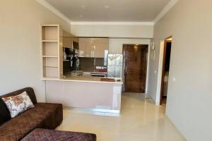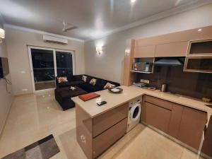 Klimatizovaný apartmán New 1BHK at Central Park, Sohna Road, Ayaansh Resort zahrnuje 1 ložnici, TV s plochou obrazovkou, jídelní kout, kuchyň s lednicí a obývací pokoj.