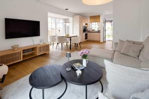 Die Unterkunft Newly built beach house with sauna close to beach ist ausgestattet mit 2 Schlafzimmern, einer Küche mit einem Kühlschrank und einem Geschirrspüler, einer Waschmaschine und 2 Badezimmern mit einem Haartrockner. Es gibt einen TV.