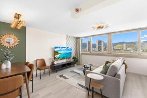 Apartament Newly Renovated 1 Bdr for 6, Elegant Condo, Minutes to the Beach, Heart of Waikiki z balkonem oferuje sypialnię, salon z TV, łazienkę z prysznicem oraz kuchnię z lodówką i piekarnikiem. Z okien obiektu roztacza się widok na miasto. Ręczniki i pościel są dostępne w apartamencie.