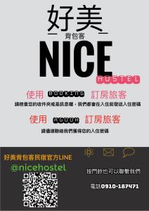Situato a Magong e distante 200 metri da Four Eyes Well, Nice Hostel prevede il banco escursioni, camere non fumatori, una sala comune, il WiFi gratuito in tutta la struttura e una terrazza. L’alloggio è posizionato a 1 km da Xiying Rainbow Bridge, 1,7 km da Penghu Living Museum e 2,2 km da National Penghu University of Science and Technology. Nice Hostel organizza navette aeroportuali e fornisce il noleggio biciclette.