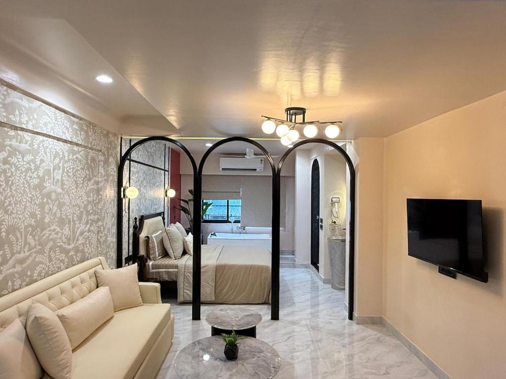 Klimatyzowany apartament Nivara Luxury Jacuzzi Suite in Koregaon Park posiada sypialnię i telewizor. Na miejscu znajduje się kuchnia.