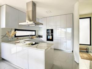 The villa is composed of 3 bedrooms, a fully equipped kitchen, and 2 bathrooms. A flat-screen TV is featured.